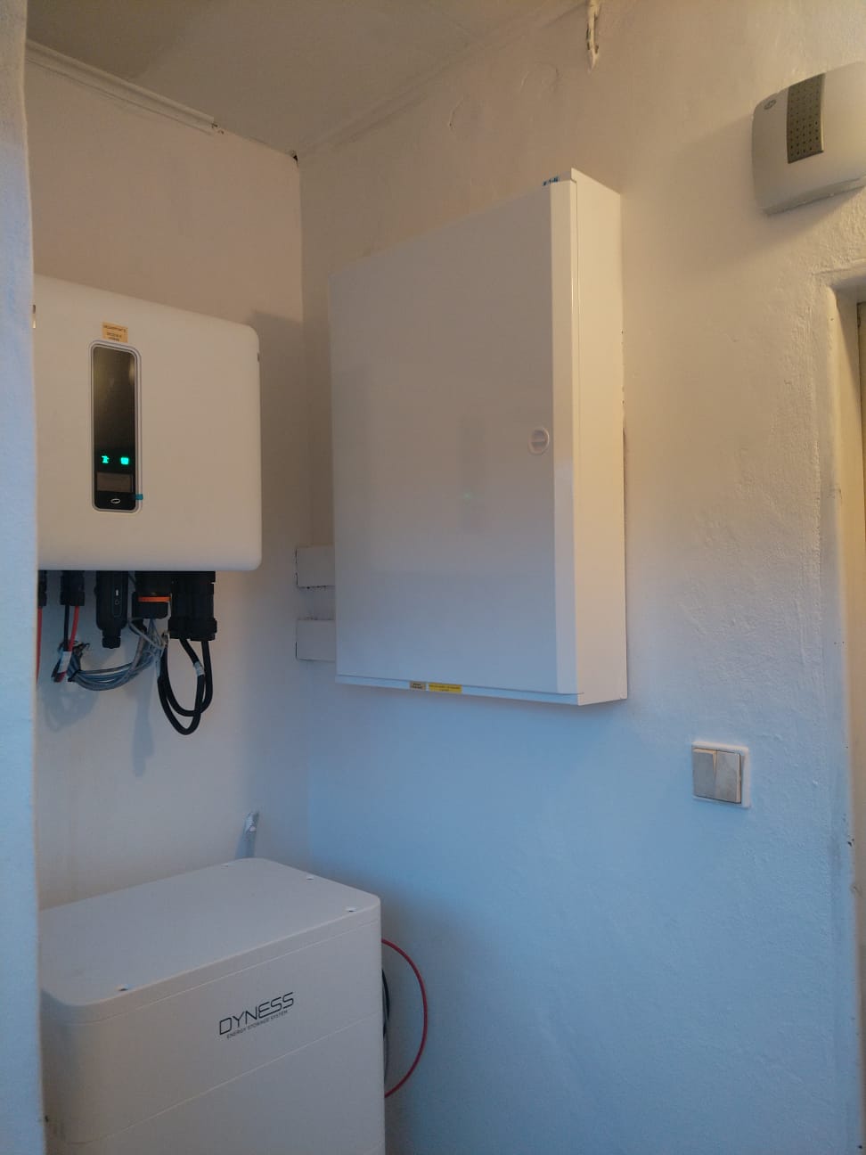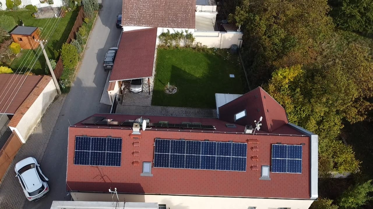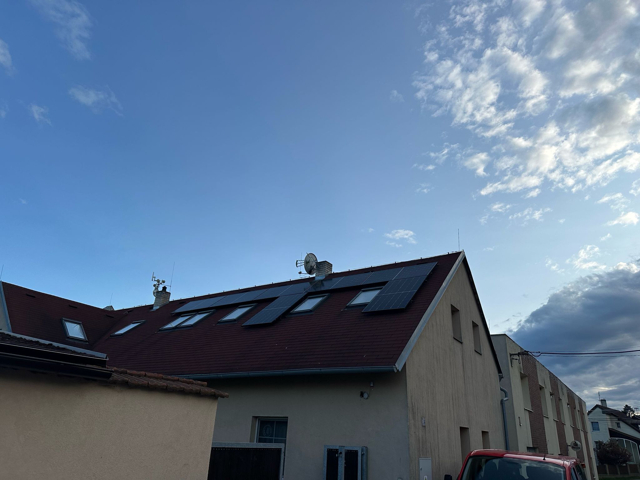 Instalovaný výkon 9,54 kWp, roční výroba 9110 kWh, bateriové úložiště 14,20 kWh. Realizace FVE v Dolanech u Kladna.