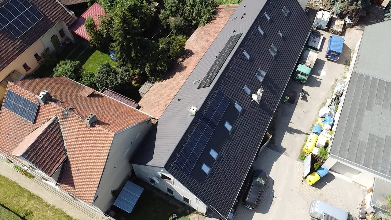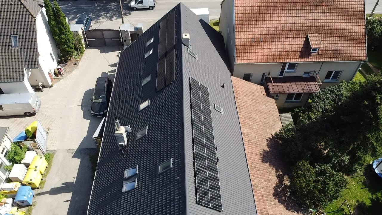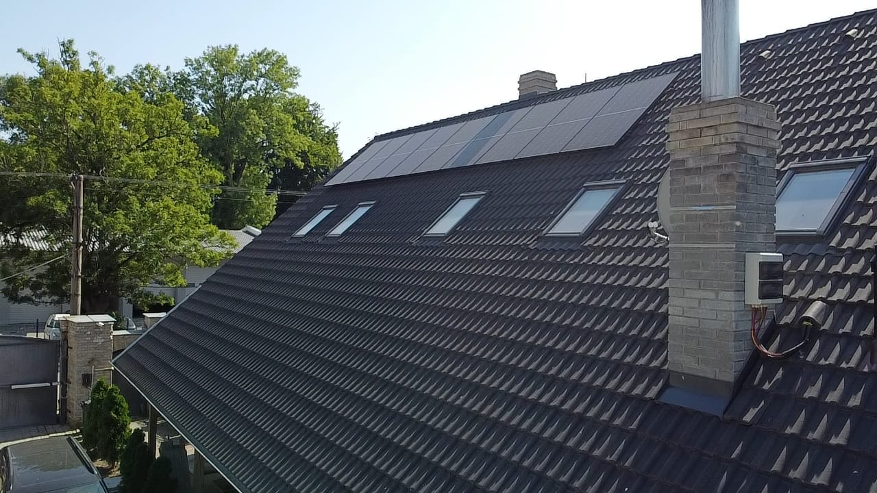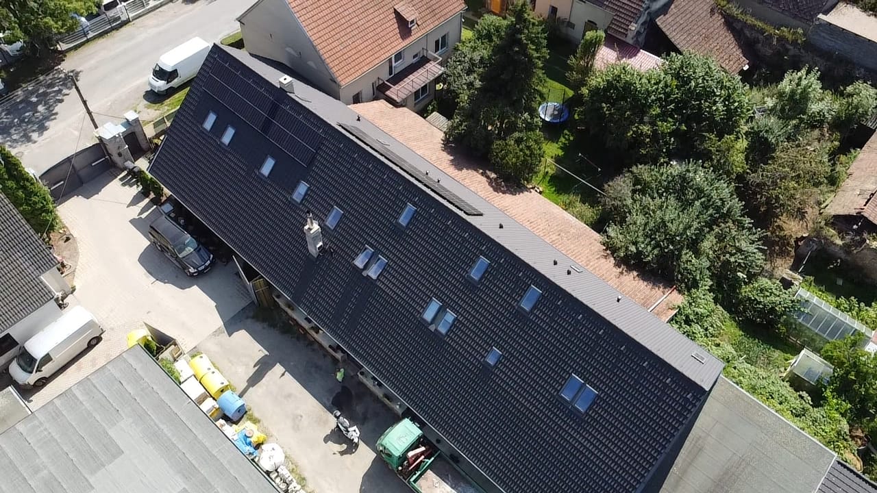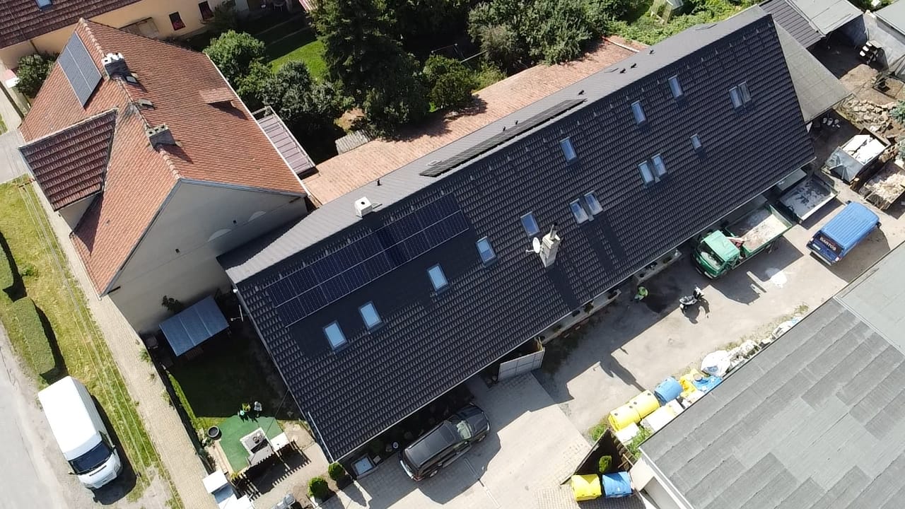 Instalovaný výkon 9,97 kWp, roční výroba 9300 kWh, bateriové úložiště 10,66 kWh. Realizace FVE v Tuchlovicích.